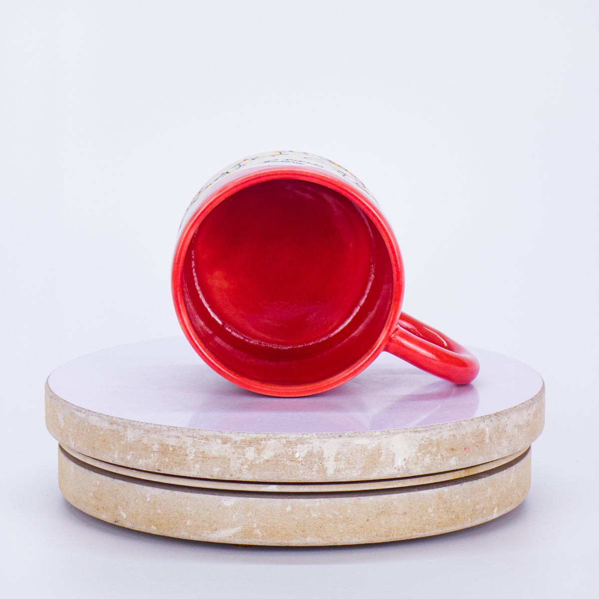 Odlewany i ręcznie malowany kubek z napisem.