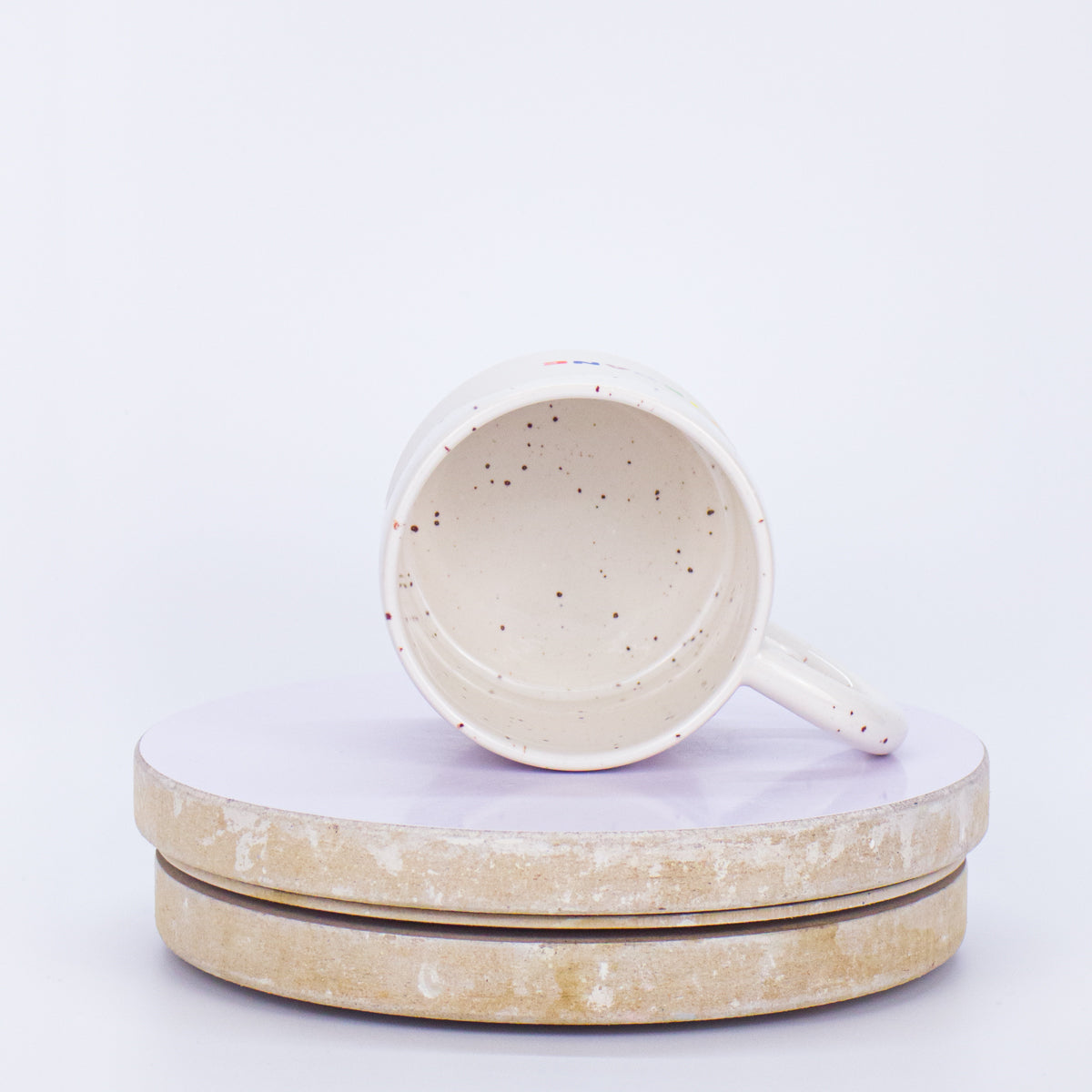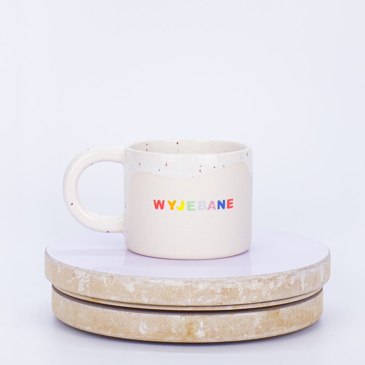 Odlewany i ręcznie malowany kubek z napisem.
